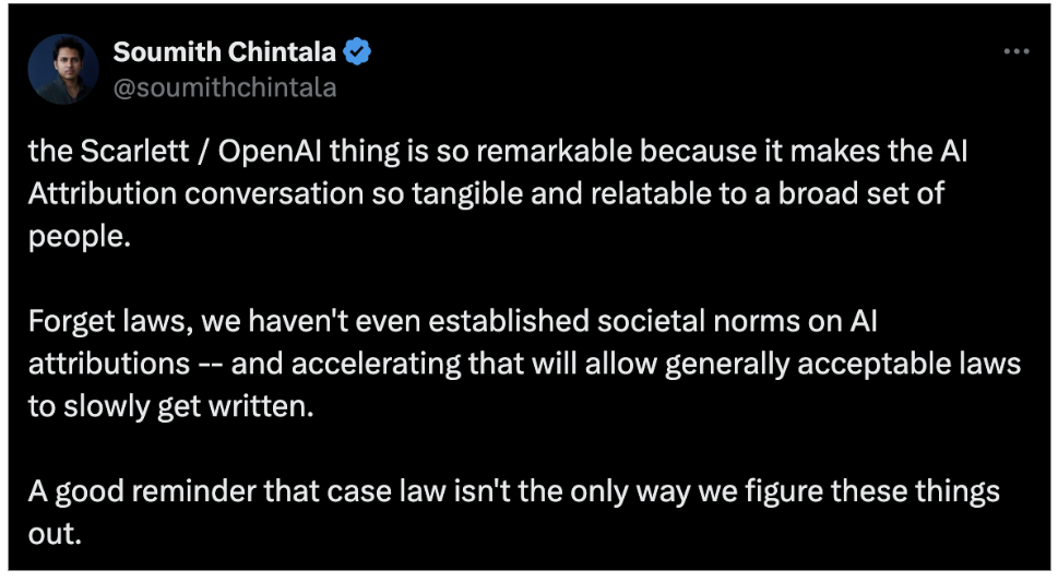 Soumith’s take: “People in current society have rights based on various aspects: property, rights, copyrights, likeness rights. Some of those rights are being questioned by AI models. Various creative artists have been getting unhappy. I think we need moments like these to understand when AI is not expressing something that works according to current social norms. These moments are going to allow people to understand each other, organize with each other, and question the direction we want to go around preserving or not preserving these rights with generative AI.”