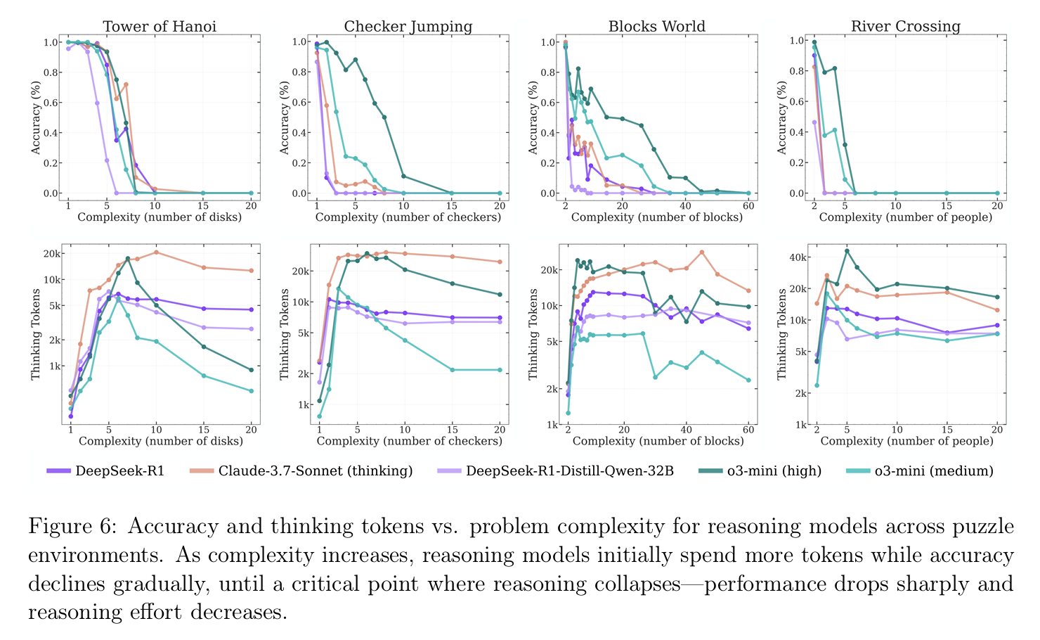 The researchers set up a number of logic puzzles and varied the degree of complexity up and down for each task, testing model accuracy and compute used (measured in “thinking tokens” outputted). They compared multiple reasoning models (Claude, o3, DeepSeek) along with their non-thinking/reasoning variants.