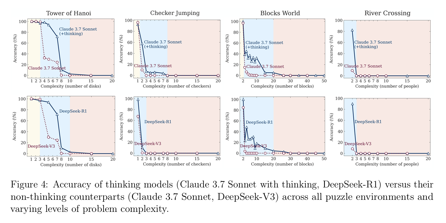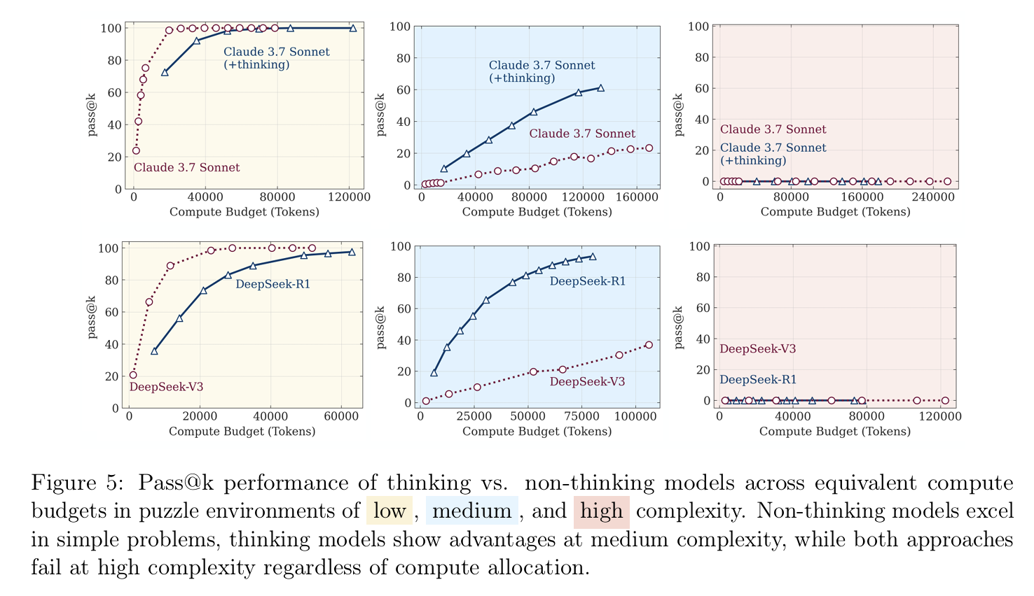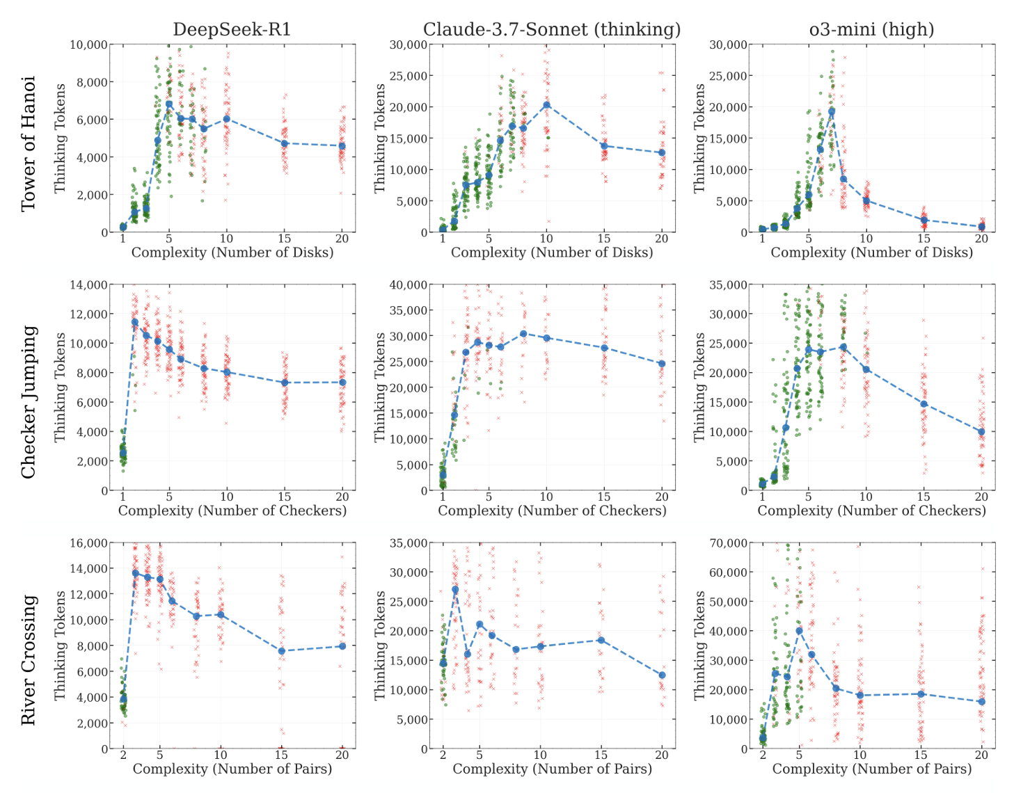 The researchers set up a number of logic puzzles and varied the degree of complexity up and down for each task, testing model accuracy and compute used (measured in “thinking tokens” outputted). They compared multiple reasoning models (Claude, o3, DeepSeek) along with their non-thinking/reasoning variants.
