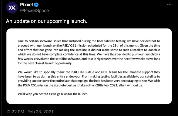 Without the dependence on an external partner, the Pixxel team finished the process of building and testing their satellite in just 9 months. They closed out the year with renewed optimism that 2022 would be the year they finally popped their space cherry.